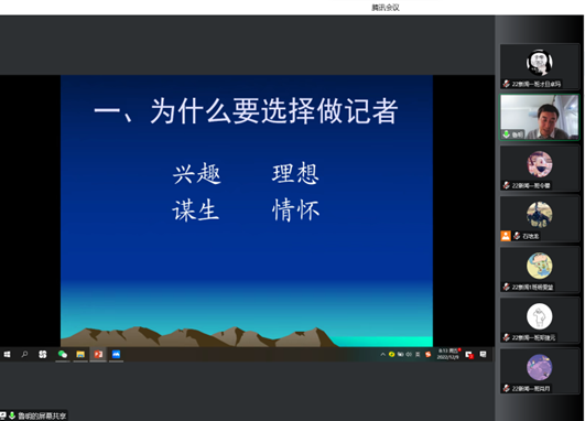 2022年12月9日上午、12月16上午,根据英国正版365官方网站“业界精英进课堂”活动安排,英国上市公司365新闻学专业2006届毕业生、《农民日报》社甘肃记者站负责人、主任记者分别进入2022级新闻学1班、2022级新闻学2班的“专业导引课”课堂,开展了题为《关于新闻从业的一些认识和感想》的讲座,英国正版365官方网站石培龙主持讲座,22新闻学本科生在线聆听了鲁明老师的学术分享并互动交流。