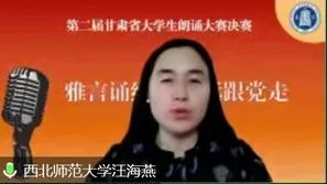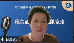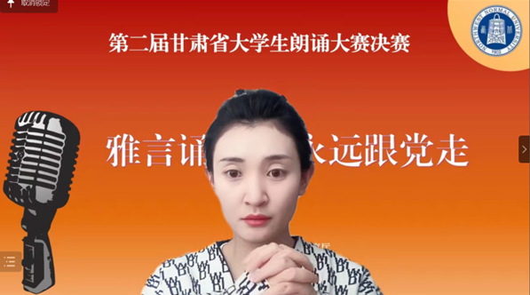 大赛评委组组长于芳老师代表评委组致辞,她向甘肃省教育厅、各位老师和参加本次活动的每位同学们问好,并强调朗诵不仅仅是语音面貌的呈现,更重要的是思想的表达,是青年家国情怀的一种爆发。